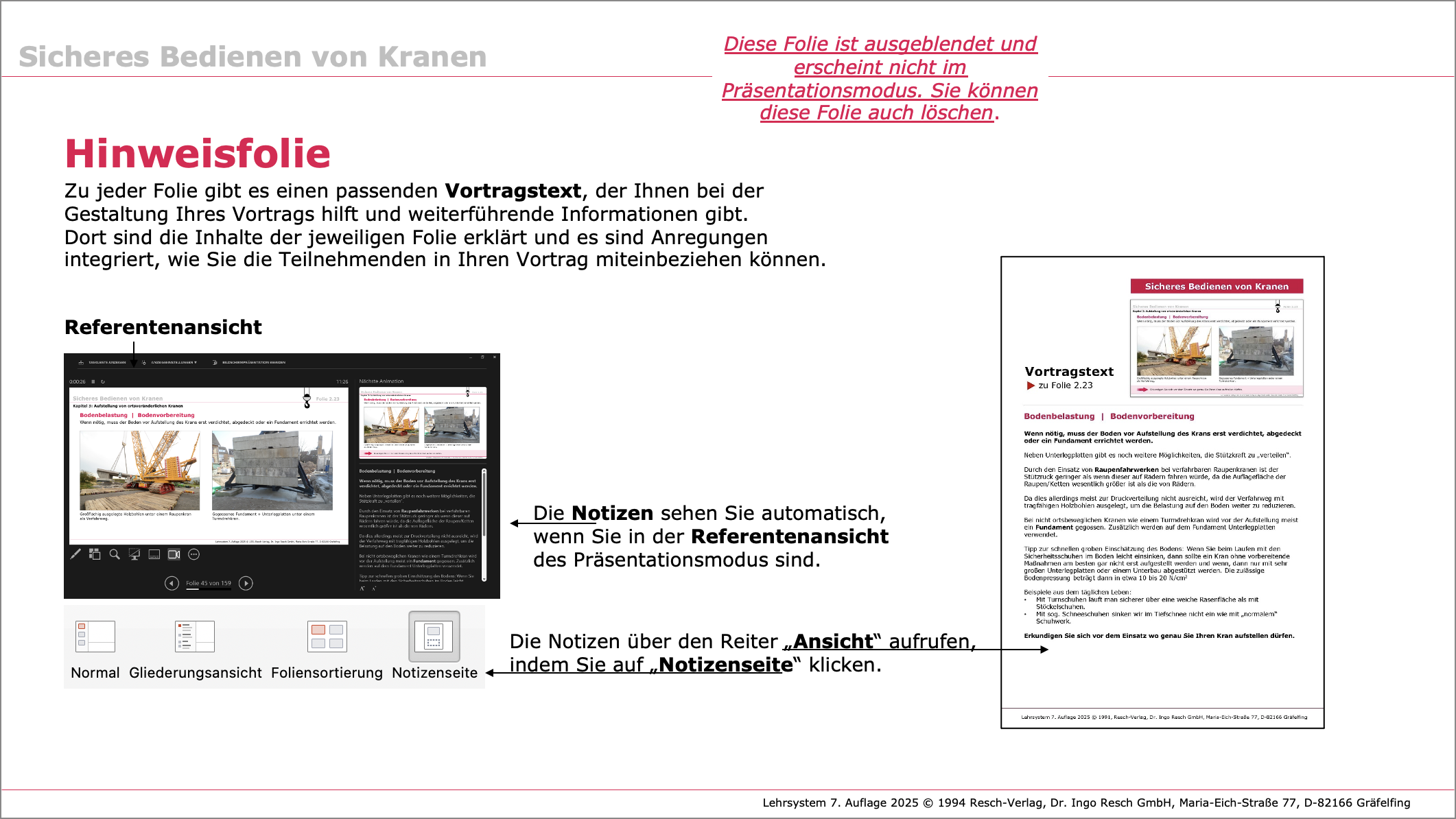 weitere Zusatzmodule beim Resch-Verlag erscheinen. Geplant ist, dass dieses Lehrsystem schlussendlich nur noch die allgemeinen Grundlagen beinhaltet, die für alle Kranbauarten relevant sind. Die Besonderheiten der konkreten Bauarten werden dann in den jeweiligen Zusatzmodulen behandelt. So erhalten alle Ausbilder / Qualifizierenden eine maßgeschneiderte Präsentation, die mehr Informationen zur jeweilig relevanten Bauart enthält.